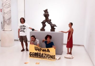 Ativistas climáticos se colam à escultura Boccioni, em Milão
